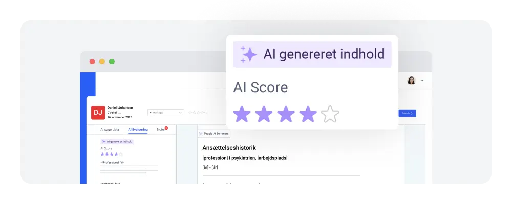 AI fjerner identitetsmarkører og erstatter CV og ansøgning med anonymiserede versioner, så fokus forbliver på det faglige. Det skaber et objektivt grundlag for skarpere beslutning i ansættelsesudvalget.